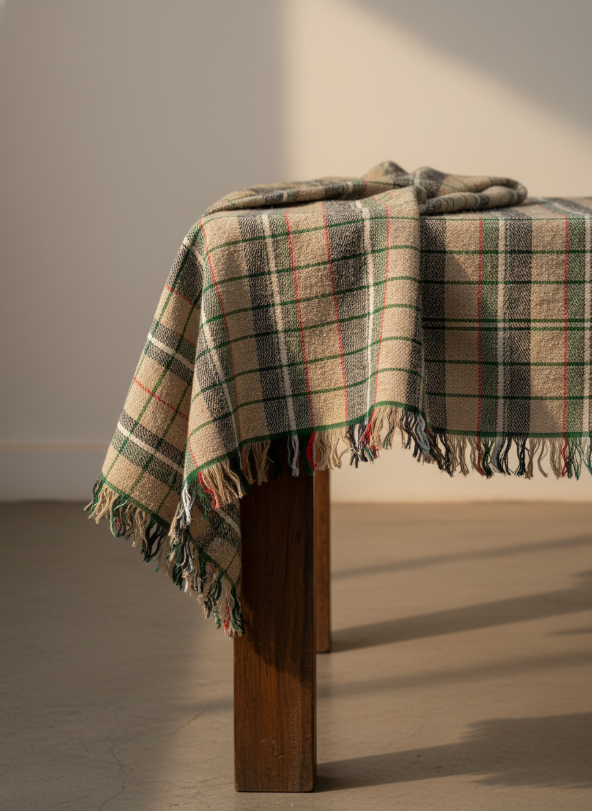 Bring a warm , rustic charm to your home with this earth-toned multicolor checked spread set on neutral beige base, the design features a harmonious mix of green, red, blue, and mustard lines, creating a vibrant yet grounded aesthetic. The subtle checked pattern adds texture without overwhelming the décor, making it suitable for living rooms, verandahs, reading corners, and bedroom layouts.